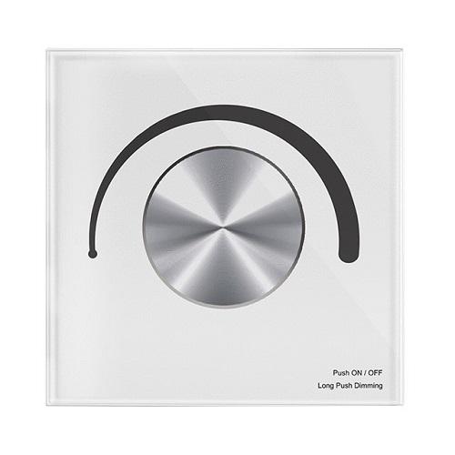 Sieninis TRIAC šviesos reguliatorius 100-240V AC 1x 1.5A, vienos spalvos LED juostelėms, kaitrinėms bei halogeninėms lempoms, 1 kanalo, su mechaniniu ratuku, palaiko 50 apšvietimo lygių valdymą, Wi-Fi, Tuya