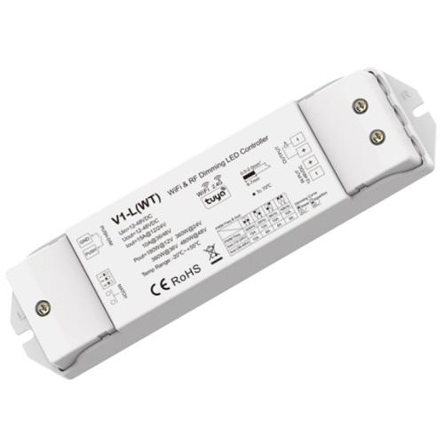 V1-L(WT) nuolatinės įtampos valdiklis 12-48V DC 1x 15A, vienos spalvos LED juostelėms, su Push-Dimm funkcija, 1 kanalo, Tuya, Wi-Fi