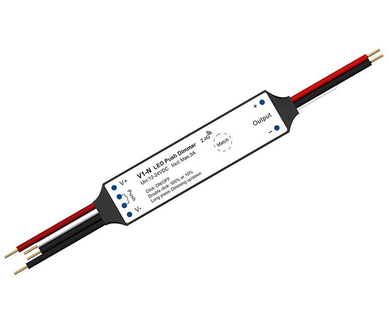 V1-N nuolatinės įtampos valdiklis 12-24V DC 1x 3A, vienos spalvos LED juostelėms, su Push-Dimm funkcija, 1 kanalo, maks. 5m juostai, 75W
