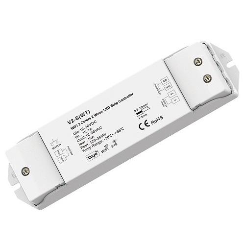 V2-S(WT) nuolatinės įtampos valdiklis 12-36V DC 1x10A, dviejų spalvų LED juostelėms, 1 kanalo, dvilaidis, su Push-Dimm funkcija, Tuya, Wi-Fi